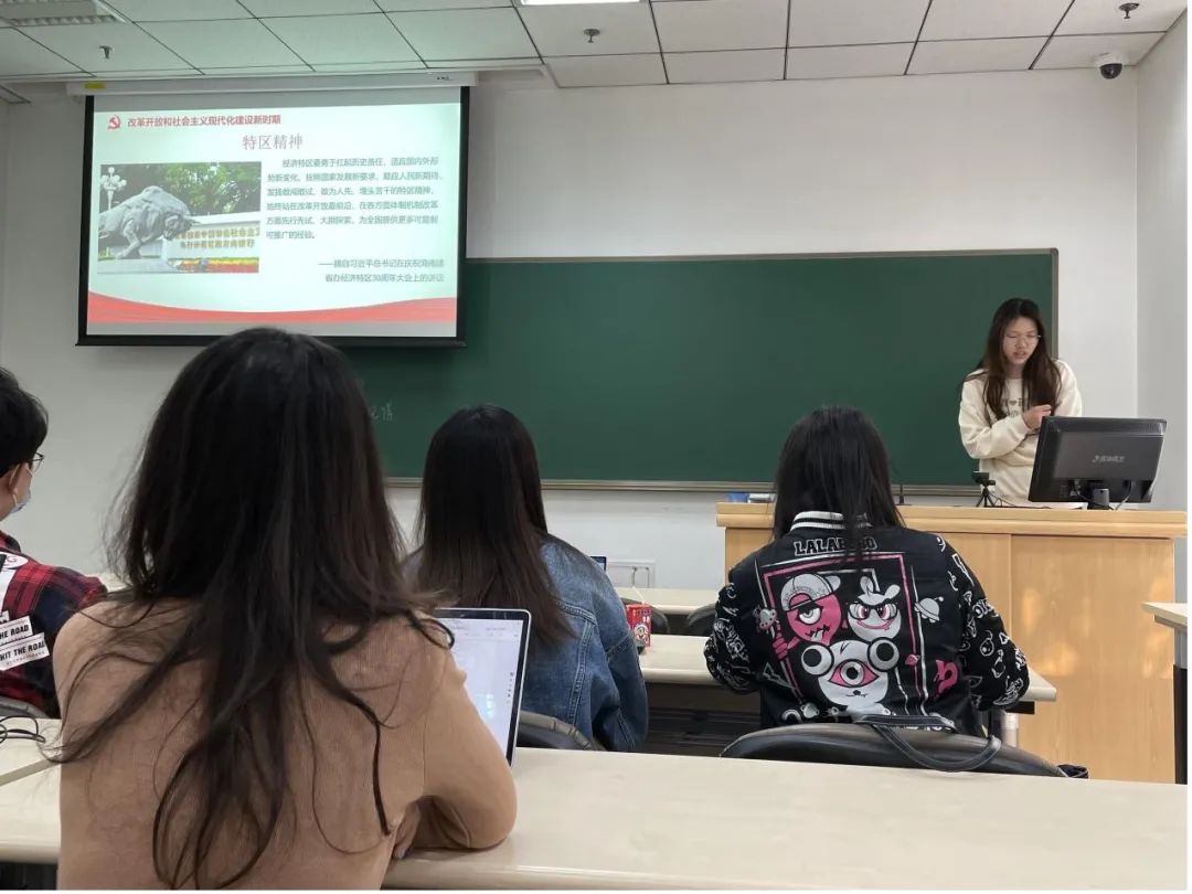 之后,组织委员陈颖从作为精神之源的伟大建党精神开始,带大家学习了解共产党人的精神谱系。在新民主主义革命时期的以坚定信念、求真务实、一心为民、无私奉献为主要内涵的苏区精神;在社会主义革命和建设时期,一不怕苦、二不怕死、顽强拼搏、甘当路石、军民一家、民族的“两路”精神;改革开放和社会主义现代化建设新时期,敢为人先、埋头苦干的特区精神,特别能吃苦、特别能战斗、特别能攻关、特别能奉献的载人航天精神。通过这些可歌可泣的精神史,加深了同学们对百年党史的理解。