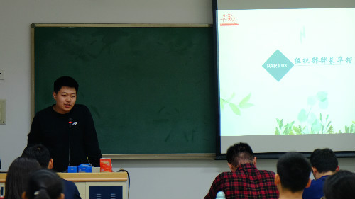 随后,常务副会长张捷致欢迎辞。首先他介绍了党促的主要架构、各部门的职责以及主要活动。随后,他讲到党促的发展问题,强调了人对一个组织的重要性,并对大家提出了三点期望:一是脚踏实地,二是勤于思考,三是敢说真话。最后他衷心祝愿每个人都能在大学开启新的篇章,在党促锻炼能力的同时收获情谊。
