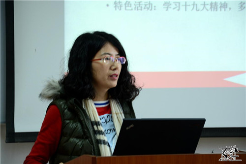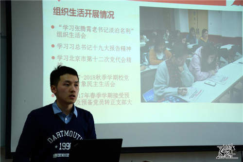 第二位述职的是本科党支部书记娄嘉亮。他首先介绍了支部的基本情况,并总结了去年的工作成果。在2017年度,本科党支部尝试与学院青年志愿者协会合作,通过轮流做志愿活动的方式,不仅切实传递爱心,而且也彰显了作为中共党员的责任与担当。接着,他针对支部目前存在的“认为入了党就算是进了保险箱”的问题,提出了完善考核机制,加强了党建促进会与党支部合作等具体措施。党委副书记唐颖充分肯定了本科党支部的工作,赞扬了他们严谨踏实的工作态度以及勇于开拓的创新精神。她提出希望本科党支部在开展活动时要充分考虑学生党员的特质,突出支部活动的特色。