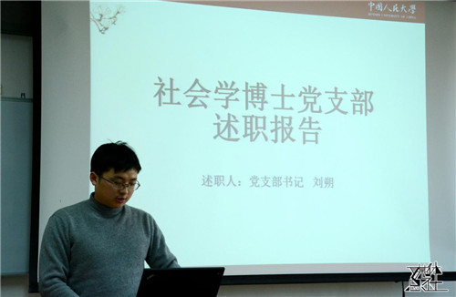 接下来进行述职的是社会学博士党支部书记刘朔,他就社会学博士党支部组织构成特点、人员转正等情况进行了介绍。对于支部中出现的人员参与活动积极性差的问题,从学业压力等角度进行了分析,并提出了加强成员们讲座、党课的参与程度,积极联系理论导师等方法予以改善。党委委员王水雄对于社会学博士党支部的工作表示肯定,勉励他们百尺竿头更进一步,并指出充分开发内部资源是促进支部理论学习水平的重中之重。