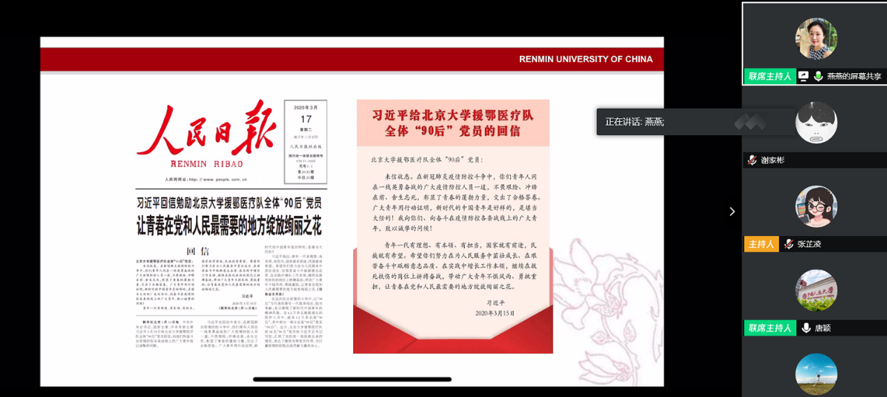 学院党委书记高燕燕为同学们讲第一节线上党课。她以“学习贯彻习近平总书记重要回信精神,认清历史责任,做新时代奋发有为的青年”为题,带着同学们深入学习习近平总书记给北京大学援鄂医疗队全体“90后”党员的回信,结合新冠疫情期间的国际局势,深入分析“百年未有之大变局”下当代青年的使命与责任。她向大家提出了三点希望:一是要勇于奋斗,练就过硬本领;二是要敢于奉献,扛起历史责任;三是要乐于奉献,追求无我境界。