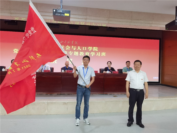 随后,林志成为培训班授旗,社会与人口学院教职工第一党支部书记、社会学系系主任朱斌作为学员代表上台接旗。