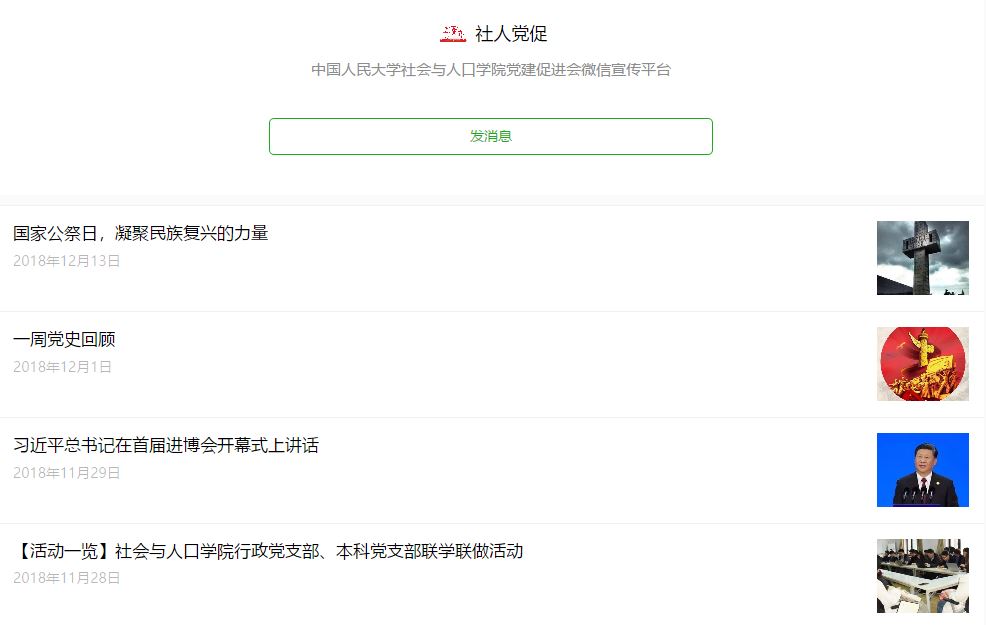 除了线下活动的开展外,党建促进会还通过微信公众号、学院官网等方式对同学们的党课学习以及日常思想宣传等工作进行跟进。如:在“社人党促”公众号上推出了“党史上的今天”、“系列讲话”、“一周党史回顾”等栏目。通过定期对重要讲话稿进行推送、在建国六十九年及建党九十七年等重大节日进行相关报道等方式鼓励同学们关心国家大事,指引同学们进行更深一步的理论学习。公众号还设立“党员先锋”专访栏目,对优秀的共产党员进行专访,旨在以党员先锋的生动事例为其他同学们树立榜样。2018年度“社人党促”微信公众号推送总计阅读量7773人次,新增关注量201人。