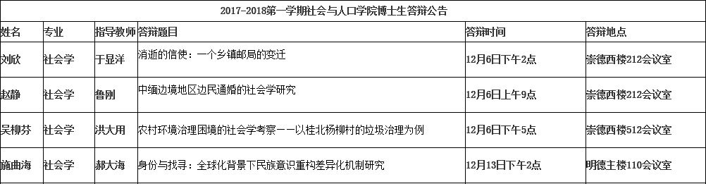 2017-2018第一学期社会与人口学院博士生答辩公告