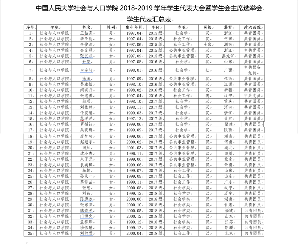 经各班级和院学生会各部门推选、学院审核,已选举出社会与人口学院2018-2019学年学生代表大会暨学生会主席选举会学生代表,具体名单附在文后。