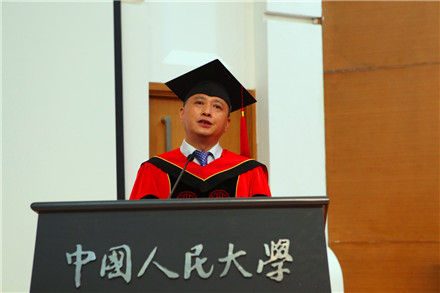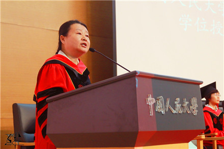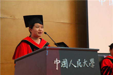 随后,校友代表范瑜女士发言。她回顾了在人大时的生活细节和时代记忆,描述了校友们现在扎实丰富的发展情况。她用平实生动的语言、真挚饱满的情感,感动了在场的每一个人。范瑜校友还结合个人经验,与大家分享了“担当”、“乐观”、“谦卑”、“学习”这四种重要的职场优秀品质,使毕业生们受益良多。