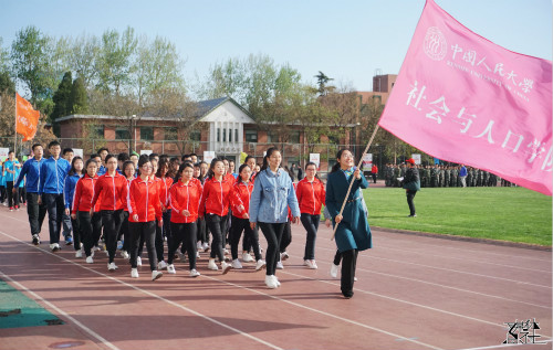 在学院党委副书记唐颖老师的带领下,社会与人口学院代表队踏着矫健的步伐,以昂扬的姿态进入运动场。红色与蓝色交织在跑道上,青春的气息扑面而来。四月的人大,因雨过天晴而更娇嫩,春日里的社人大师生,因运动的魅力而顽强拼搏。