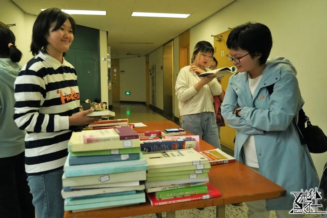 下午1点40分,青协的志愿者开始布置现场。他们将书籍分好类别,贴上标签,整齐地摆放在地面和桌面上。社人图书馆的“馆藏”丰富,既有专业课和公共课的相关教材和外语辅导材料,也有精美的画册、人文社科读本和小说等。完成布置环节,志愿者们便等开始等待同学们前来挑选书籍。