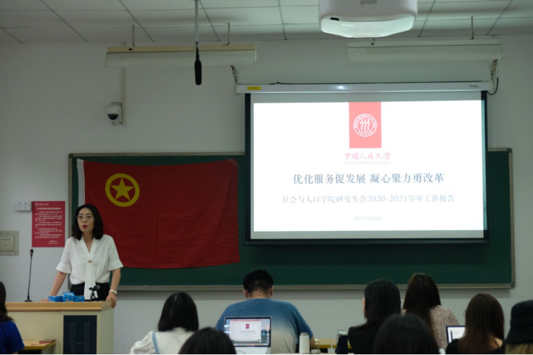 社会与人口学院研究生会主席温馨作第十八届研究生会工作报告。过去一学年里,研究生会完善组织运行机制,在机构设置、考核机制、品牌活动等方面进行有效改革。研究生会各部门积极履行部门职责,全心全意为研究生服务,在文体生活、学术科研、职业发展等多方面切实服务于研究生同学们的需求。