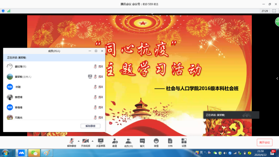 4月20日,社会与人口学院2019级本科社会学类1、2班33名同学齐聚线上会议。在会议上,1、2班的团支书首先以ppt的形式对中国与世界各国的疫情数据和中国在抗疫事业中所做出的贡献进行了简单的总体情况介绍。随后,团支书展示了首批烈士名单,播放了抗疫宣传片,让同学们对抗疫形势和抗疫工作有了更加深入全面的了解。在观看完抗疫宣传片之后,同学们还进行了分组讨论,结合青年大学习的学习感想和团课的学习内容畅谈自己的感受。其中,有的同学表达了自己对中国抗疫力量的震撼和对中国制度的应对能力、动员能力的高度评价;还有同学表达了对死难者的缅怀和对医务人员的崇敬之情;也有来自疫情严重地区的同学分享了其居家生活中面临的困难和内心的焦虑,并表达了对社区工作者的感恩。总体而言,在这次活动中,团员们积极参与,通过线上学习进一步了解了本次疫情的准确权威知识,并通过讨论和交流凝聚了青年共识,坚定了必胜信心。