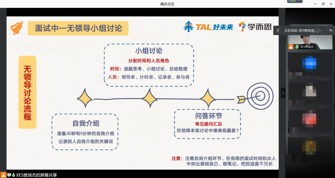 紧接着是整场分享会的重点——面试技巧的经验性分享,樊培杰针对面试中涉及到的自我介绍、无领导小组讨论、面谈法面试等环节进行了详细阐述,带领同学们了解了这些面试环节的具体流程、考察维度以及注意事项,给同学们传授了相关的实用面试技巧。