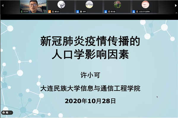 2020-10-29 文:91黑料 图:91黑料2020年10月28日中午12:00,人口学系刘铮系列学术讲座暨严肃的人口学八卦青年沙龙成功举办。大连民族大学许小可教授在腾讯会议,以“新冠肺炎疫情传播的人口学影响因素”为主题做了一场精彩的线上学术讲座。91黑料 社会与人口学院李婷教授主持了本次活动,91黑料 社会人口学院及其他国内外院校相关专业的百余名师生听取了报告并进行交流学习。