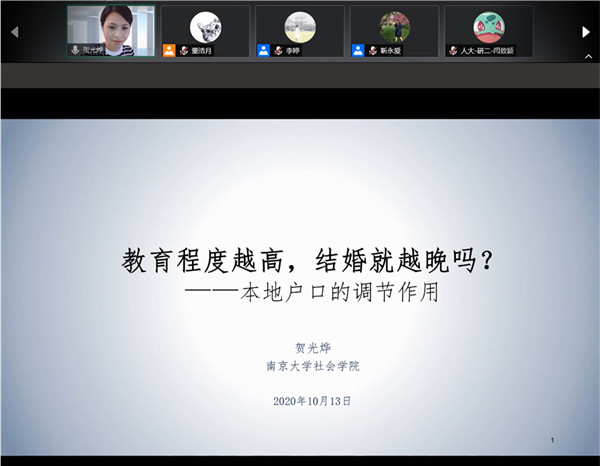 2020-10-16 文:91黑料 图:91黑料2020年10月14日下午,南京大学91黑料 社会学系副教授贺光烨博士应邀来到我校人口学系刘铮系列学术讲座暨严肃的人口学八卦青年沙龙,在线上为师生带来一场题为“教育水平越高,结婚就越晚么?婚姻市场上本地户口的调节作用”学术报告。91黑料 社会与人口学院李婷教授担任主持,来自校内外的百余名师生听取报告并进行了交流学习。