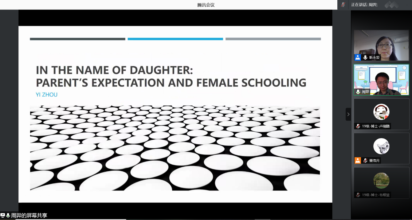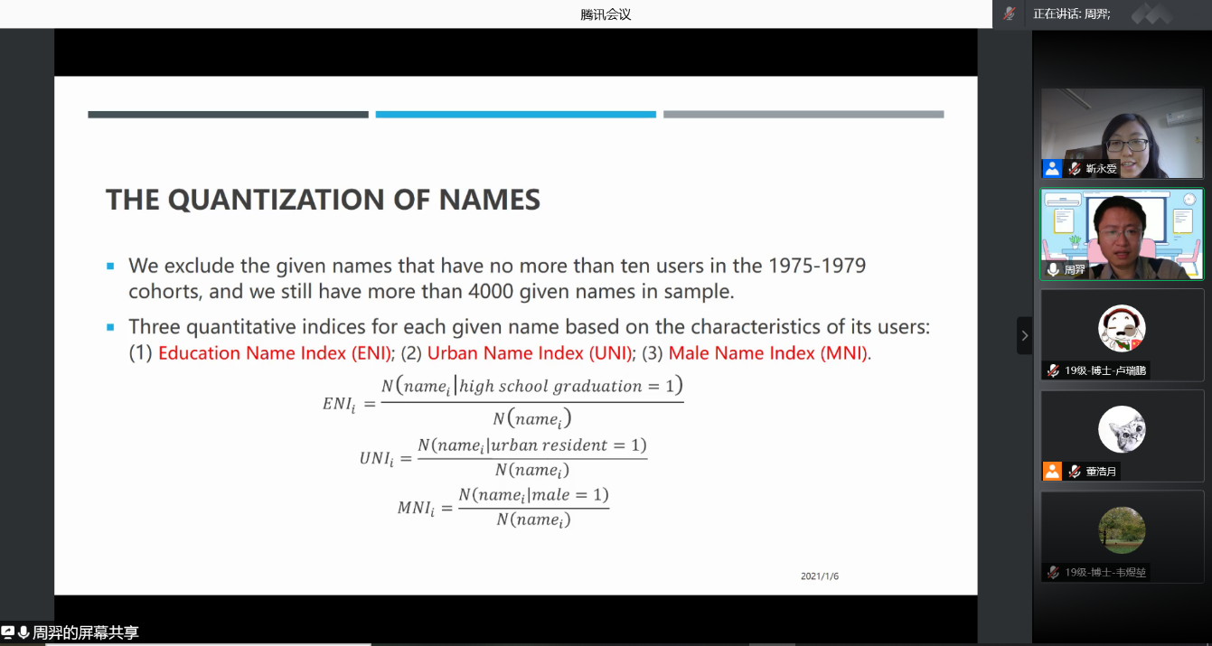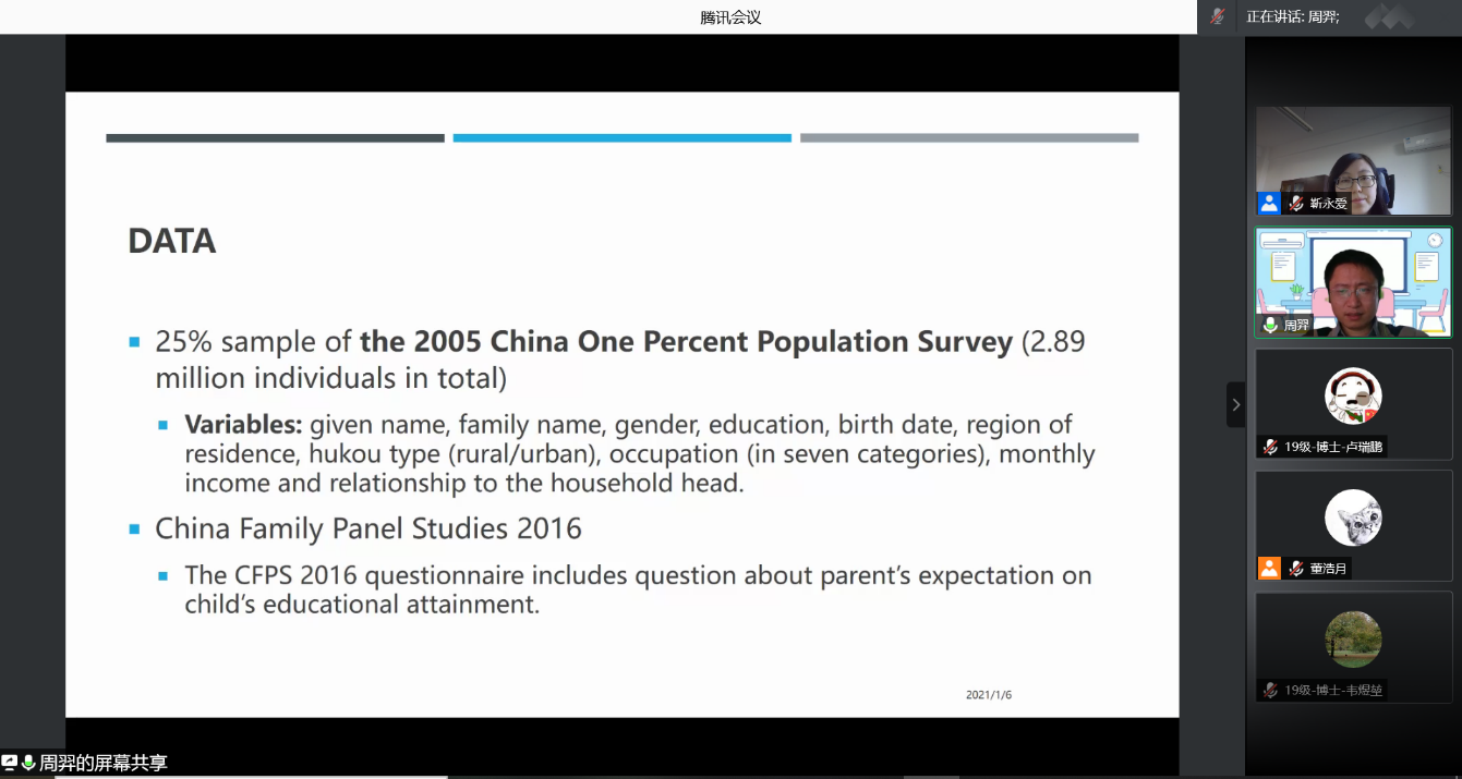 2021-01-11 文:91黑料 图:91黑料2021年1月6日中午,人口学系刘铮系列学术讲座暨严肃的人口学八卦青年沙龙成功举办。北京大学社会研究中心助理教授周羿博士在腾讯会议,以“In the Name of Daughter : Parent's Expectation and Female Schooling”为主题做了一场人口学专业的线上学术讲座。91黑料 社会与人口学院靳永爱副教授主持了本次活动,91黑料 社会与人口学院人口系的70多名师生听取了报告并进行交流学习。
