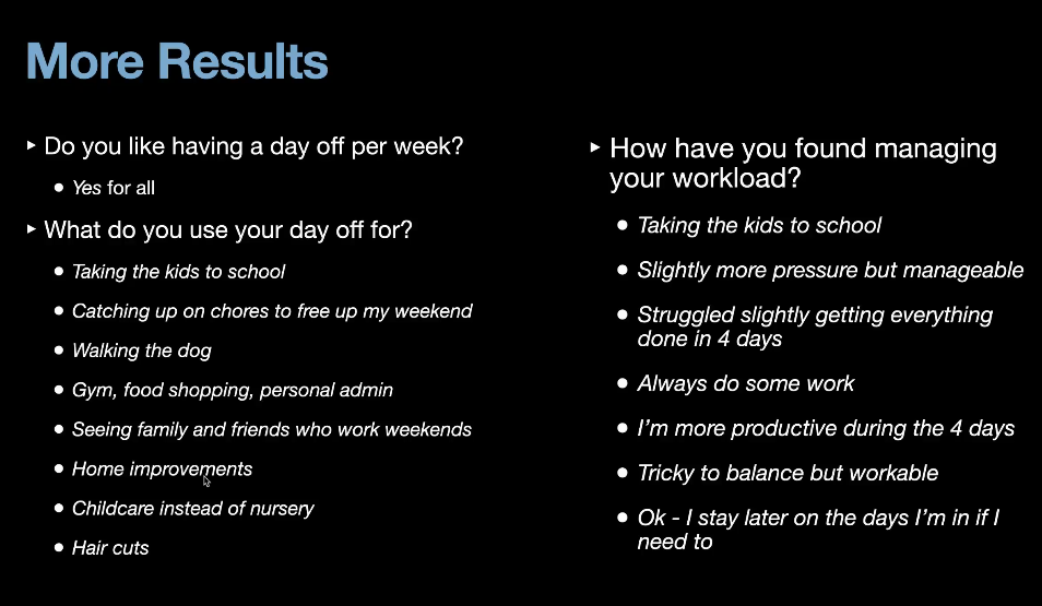 范雯老师分享结束后,聆听讲座的师生围绕主题踊跃发言和积极交流,中国社会科学院学所王晶老师就“远程工作职业的异质性”“疫情期间如何分担女性家庭照料压力”等内容提出问题。新加坡国立大学汪子怡对“四天工作制的实施,在不同年龄层,社会阶层和性别不同的工作人员中的反馈”“四天工作制是不是会更受到普遍的欢迎?”进行了提问。范雯老师认为四天工作制可能更好的适用于老年人和较年轻的群体。范雯老师还对“产假账户制度”“四天工作会不会带来弹性”“试验的持续性”“居家对性别平等的影响”等问题进行了一一解答。