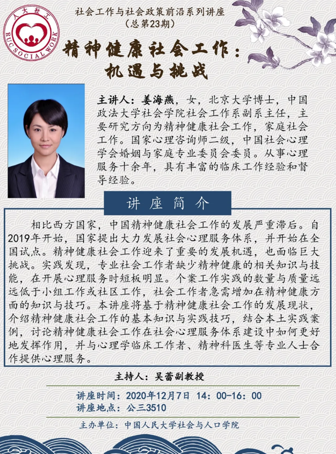 讲座预告 | 姜海燕:精神健康社会工作:机遇与挑战