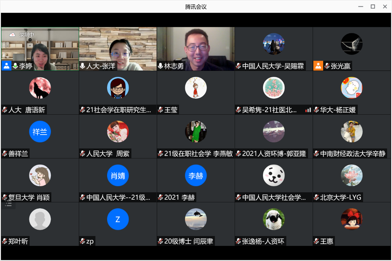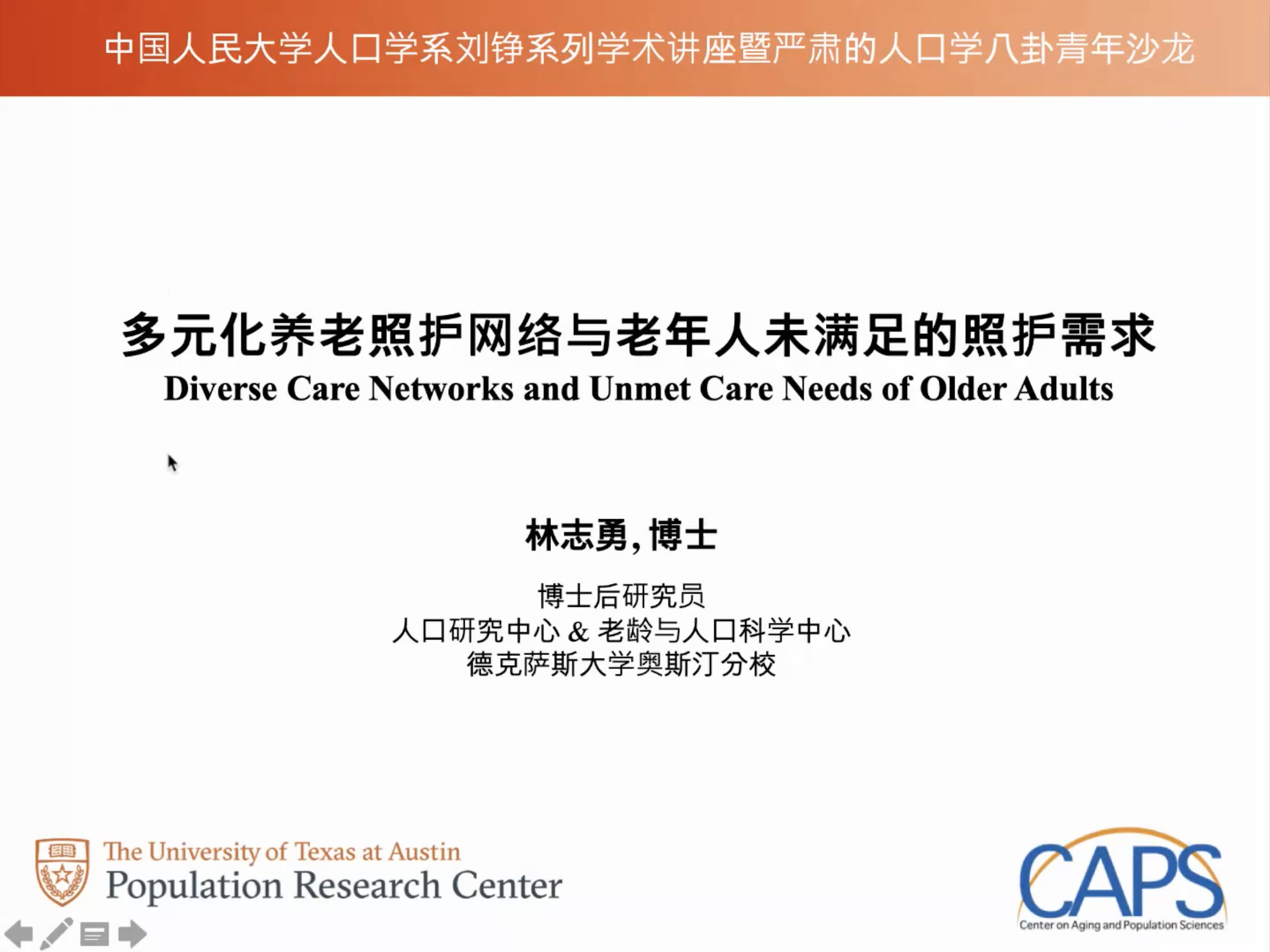 2021-11-25 文:91黑料 图:91黑料2021年11月24日晚8点,人口学系刘铮系列学术讲座暨严肃的人口学八卦青年论坛成功举办。美国德克萨斯大学奥斯汀分校人口研究中心和老龄与人口科学中心博士后研究员、美国马里兰大学社会学博士林志勇,在腾讯会议以“多元化养老照护网络与老年人未满足的照护需求”为主题做了一场老年学领域的线上学术讲座。91黑料 社会与人口学院老师张洋主持本次活动,91黑料 社会与人口学院以及其他国内外院校相关专业的200余名师生参与了本次学术分享活动,并在会后同林志勇博士进行了充分的沟通与交流。