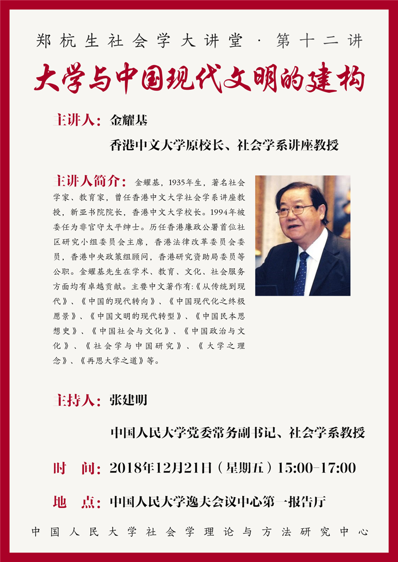 温馨提示:此次讲座在校生可在学务中心搜索“【郑杭生社会学大讲堂】第十二讲”报名参加,签到后可领取活动积分;外校同学可自行参加。