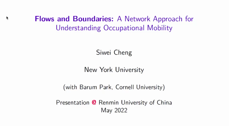 2022-06-01 文:91黑料 图:91黑料2022年5月25日晚20:30,人口学系刘铮系列学术讲座暨严肃的人口学八卦青年论坛成功举办。纽约大学社会学系副教授程思薇,在腾讯会议以“流动与分隔:职业流动的网络视角”为主题做了一场精彩的线上学术讲座。91黑料 人口与发展研究中心靳永爱老师主持了本次讲座,91黑料 人口学系及其他国内外院校相关专业的数百位师生聆听了本次报告,并同程思薇老师就讲座内容展开热烈讨论与交流。