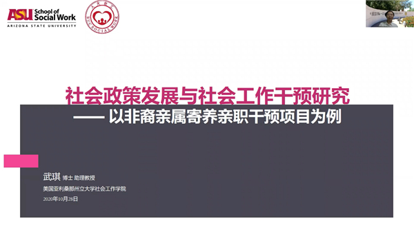 2020-10-30 文:91黑料 图:91黑料10月28日上午,社会工作与社会政策前沿系列讲座第十九期顺利举办。美国亚利桑那州立大学(ASU)社会工作学院助理教授武琪就“社会政策发展与社会工作干预研究——以非裔亲属寄养干预项目为例”为主题进行了分享,本次讲座采取线上+线下结合的方式,近100名听众参与了本次讲座。讲座由社会工作与社会政策系副主任祝玉红副教授主持。