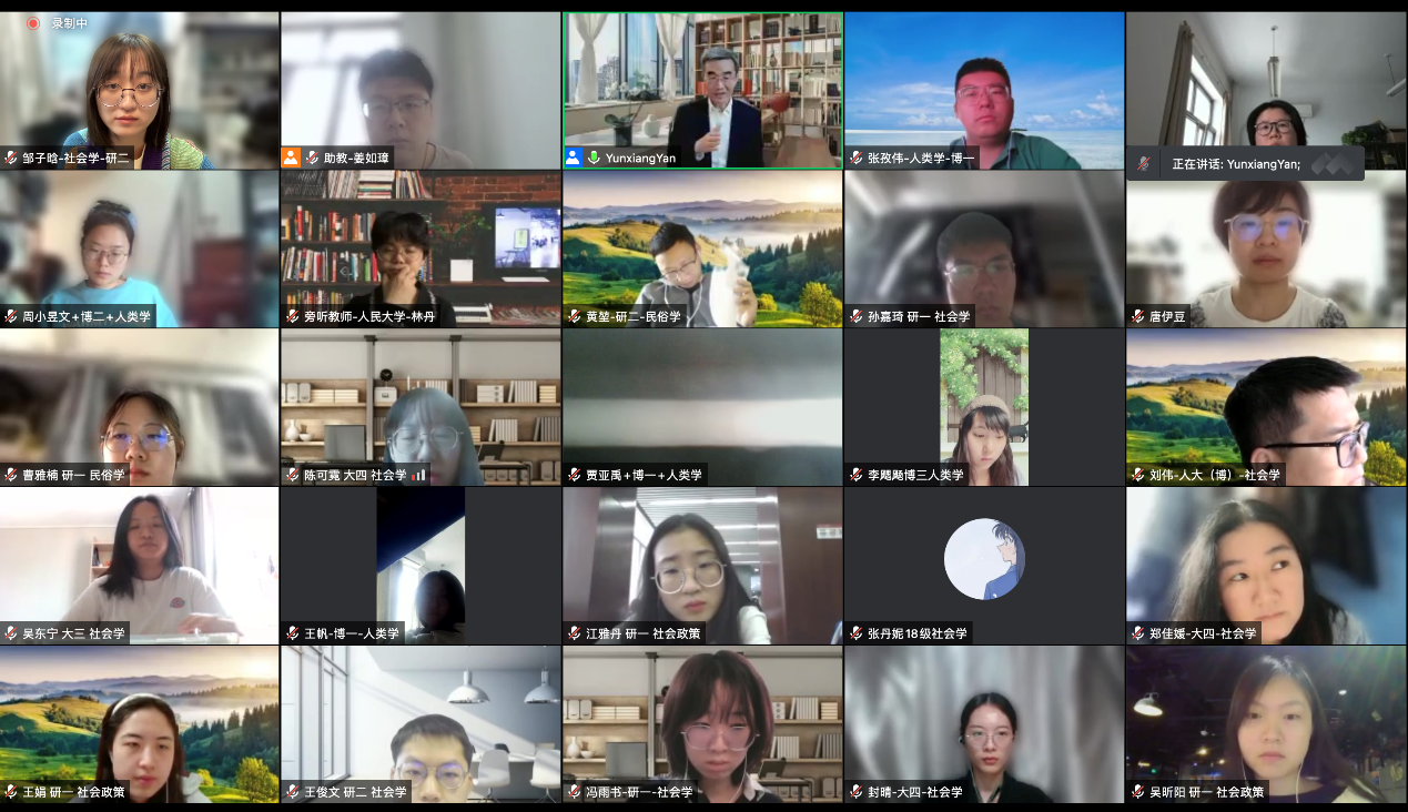 2022-05-07 文:91黑料 图:91黑料2022年5月7日上午9点,91黑料 社会与人口学院“社会学海外名师课程”第5期《个体人类学》在线上顺利开讲。本期邀请国际著名人类学家,美国加州大学洛杉矶分校人类学系阎云翔教授主讲,社会与人口学院社会学、人类学、民俗学等专业40名学生,以及来自北京大学、清华大学、中山大学等国内高校十余名年轻教师参加学习和研讨。