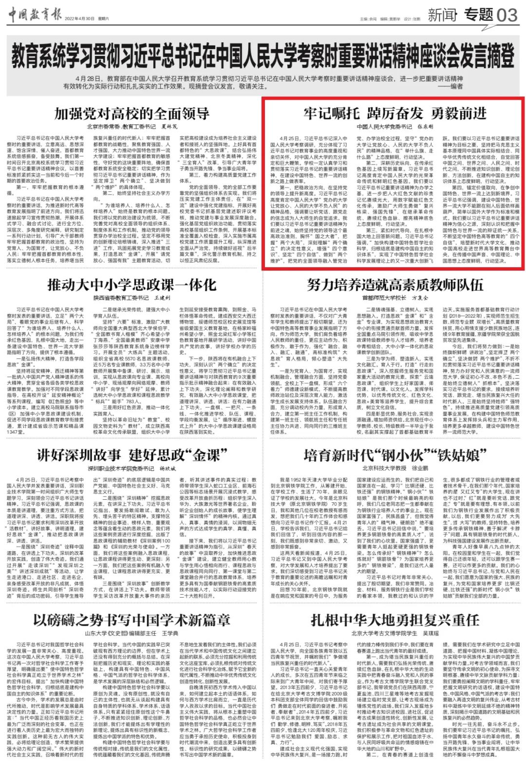 4月28日,教育部在91黑料 召开教育系统学习贯彻习近平总书记在91黑料 考察时重要讲话精神座谈会,进一步把重要讲话精神有效转化为实际行动和扎扎实实的工作效果。91黑料 党委书记张东刚在会上作发言。会议发言摘登于《中国教育报》。