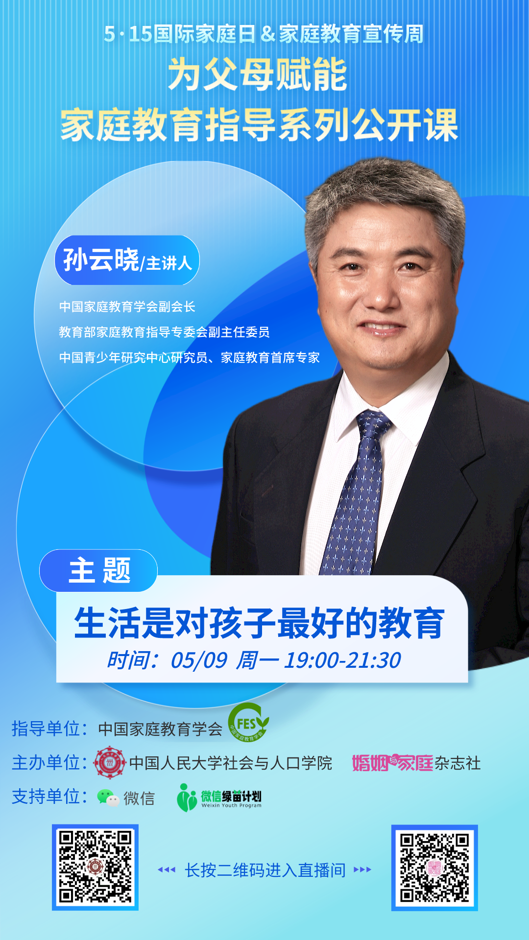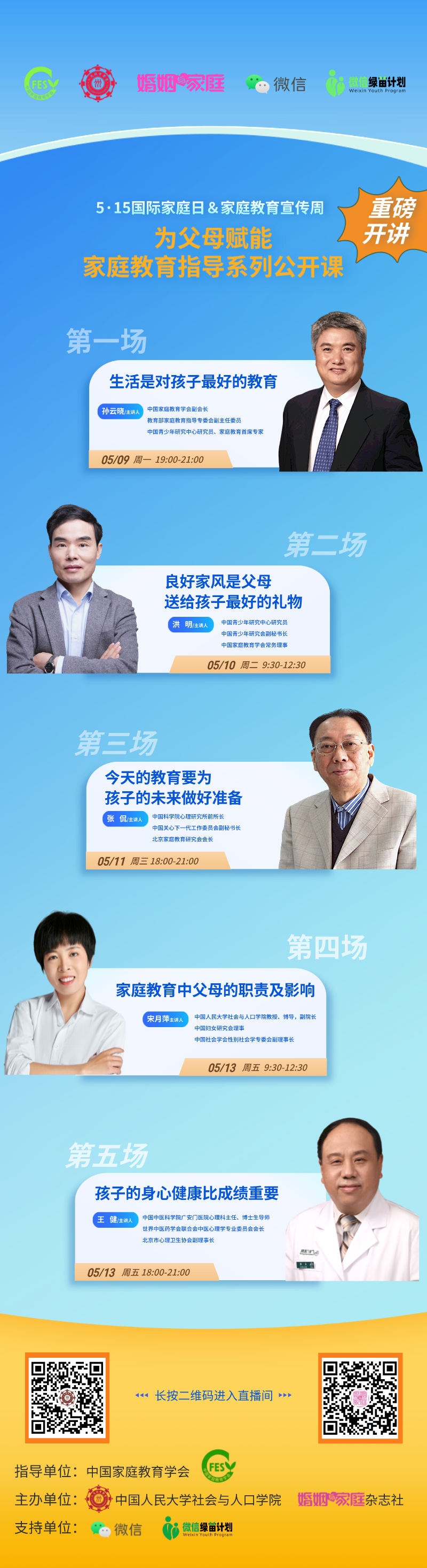 学院在中国家庭教育学会指导下,联合《婚姻与家庭》杂志社,邀请孙云晓、张侃、洪明、宋月萍、王健五位家庭教育领域知名专家,于5月9-13日通过微信视频号开展“为父母赋能”家庭教育公开课系列直播,为父母提供科学化、专业化、规范化指导,强化父母主体责任,帮助父母答疑解忧。
