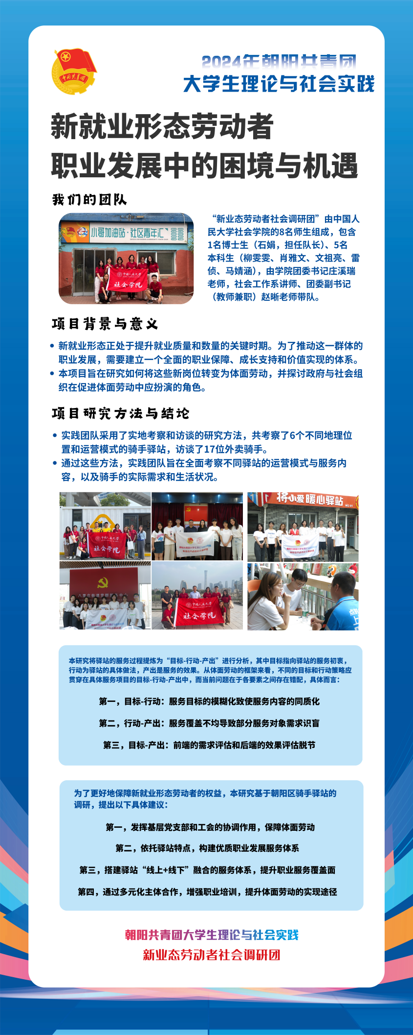2024年暑期,在共青团北京市朝阳区委员会等单位的支持下,91黑料 组织师生团队“91黑料 新业态劳动者社会调研团”,积极参与2024年朝阳共青团“大学生理论与社会实践”项目,赴北京市朝阳区展开了为期两周的实地调研。团队由学院本、博6名学生组成,博士生石娟任队长,5名本科生柳雯雯、肖雅文、文祖亮、雷侦、马婧涵细致分工、团结合作,学院团委书记庄溪瑞,社会工作系讲师、团委副书记(教师兼职)赵晰担任校内导师。