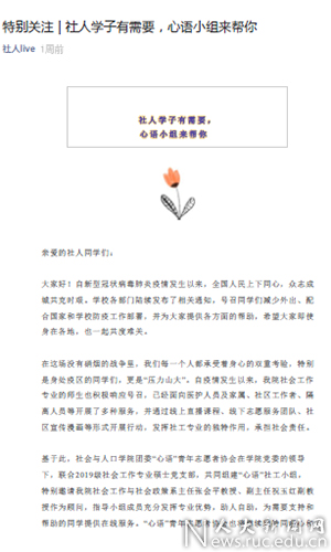 2.建立“心语”社工小组。团委“心语”青年志愿者协会在学院党委领导下,联合2019级社会工作专业硕士党支部,共同组建“心语”社工小组,特别邀请学院社会工作与社会政策系主任张会平教授、副主任祝玉红副教授作为顾问,指导小组成员充分发挥专业优势,助人自助,为需要支持和帮助的同学提供在线服务。社人live公众号发表1篇倡议《特别关注|社人学子有需要,心语小组来帮你》,小组完成1份具体服务指南,在线服务已经开通。