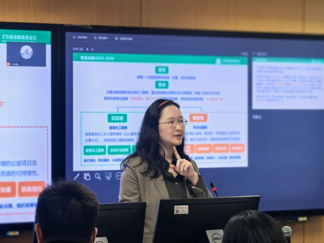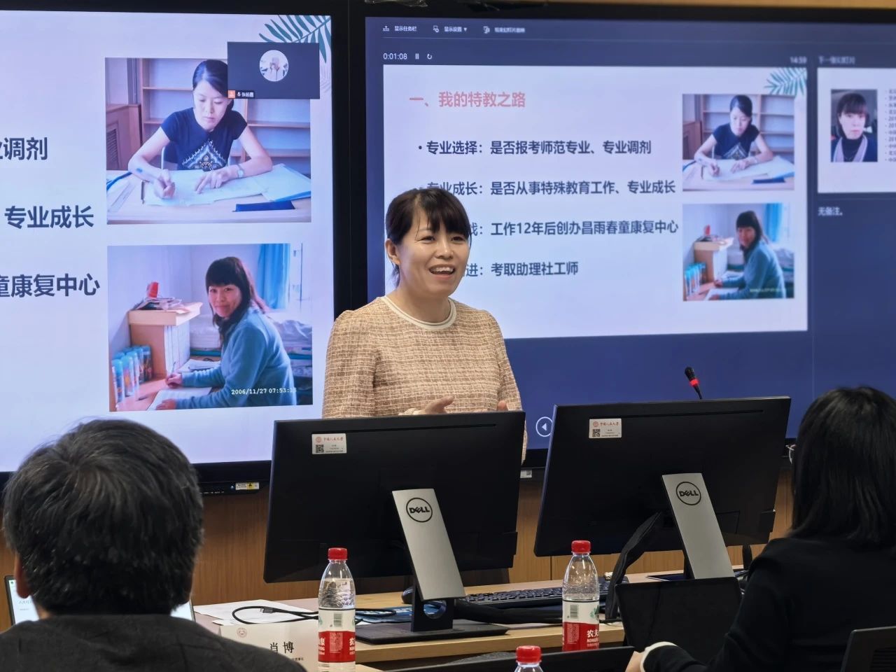 昌平区昌雨春童康复中心主任刘红艳进行了以“共融共生:社会工作者如何在助残领域开展工作”为主题的分享。她首先分享了自己的个人经历和特殊教育领域的经验。接着介绍了昌雨春童康复中心的基本情况和主要工作场所、服务对象即特殊儿童面对的问题和挑战。最后,她介绍了助残社工的主要服务内容和形式,包括生活帮扶(协助障碍家庭解决实际困难)、心理支持(心理沙龙、志愿服务)、社区康复服务、宣传倡导、促进社会融入(社区活动、社会参与)、权益维护(链接资源,法律援助)等。