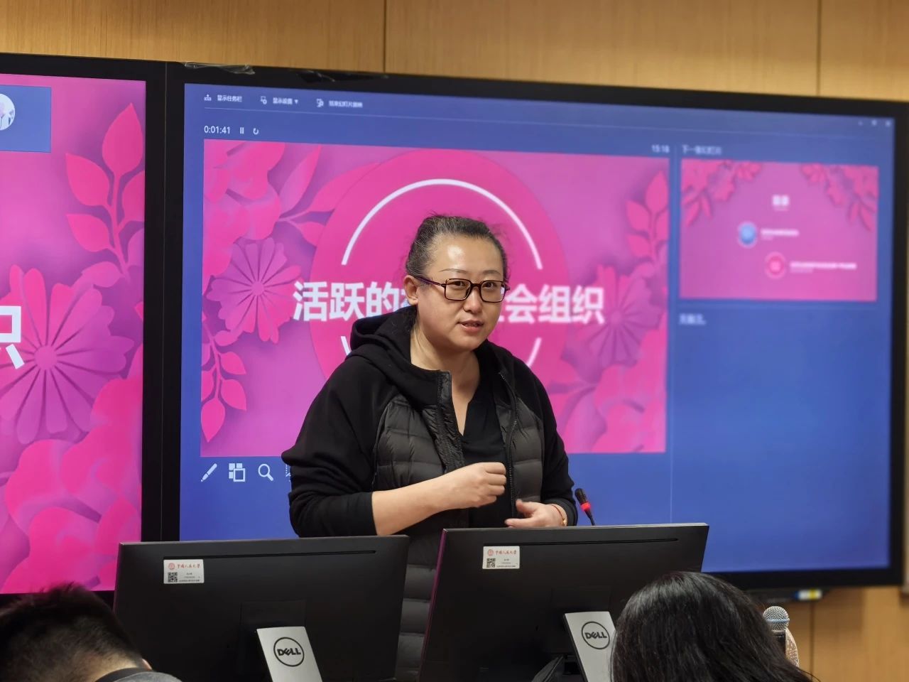 东城区建国门街道社工服务中心主任杨倩做了“活跃的社区社会组织”为题的分享。她以“社区好声音”为例,介绍了社区文体团队的活力和作用。她指出,在社区服务当中,更多的是要从居民的兴趣出发,吸引热情、有活力的人,发挥居民的能动性。接着,她就如何为社区组织赋能展开了介绍,包括参与社区文体活动、内部建设促进组织活力、增加出镜率、组织多元化等做法。杨老师还介绍了老年协会、老年学校、红线联姻、义务理发、夕阳为老等活跃的社区社会组织和楼院自治案例、老友会客厅服务、微视记录者、赋能益学等专业服务,展示了社区社会组织创意策划、群力共举的力量。