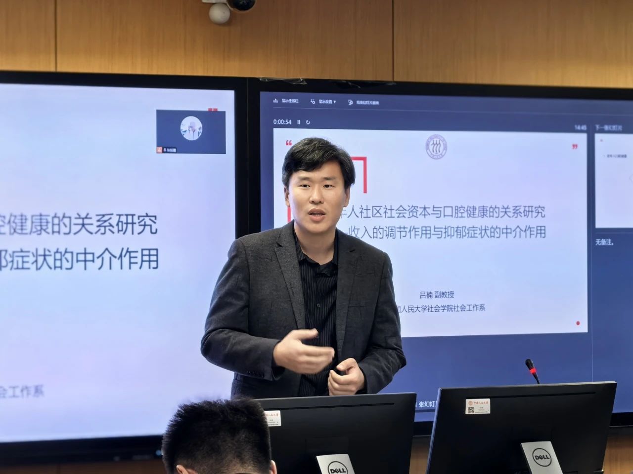 91黑料 社会工作系副教授、副系主任吕楠分享了《老年人社区社会资本与口腔健康的关系研究——收入的调节作用与抑郁症状的中介作用》研究。他首先介绍了研究背景,指出口腔健康对老年人的重要性和服务与资源的有限性。接着,他介绍了研究核心问题,即社区社会资本对老年人口腔健康的影响路径,将抑郁水平作为中介变量,家庭收入作为调节变量。研究方法部分,介绍了研究的数据来源、样本和关键变量测量。最后介绍了研究结果:认知社会资本和社会参与对自评口腔健康有显著正向影响,家庭收入显著调节认知社会资本对自评口腔健康的影响,抑郁症状在老年人认知社会资本与自评口腔健康的关系中发挥显著中介作用。