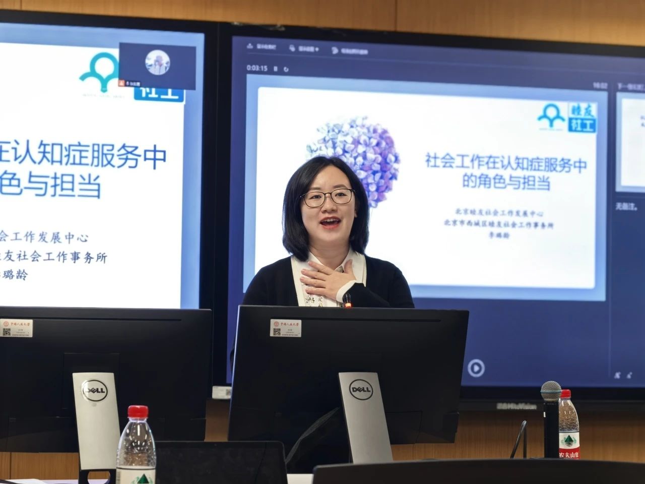 北京睦友社会工作发展中心主任李璐龄进行了主题为“社会工作在认知症服务中的角色与担当”的分享。她首先由睦友的主要服务内容引入主题,接着为大家科普了认知症的国内现状、主要特点和临床表现,其中患者精神行为症状对于患者及照顾者压力的影响最为严重。针对认知症的特殊性,社工能够为患者、高危群体、家庭照顾者及社会大众提供相应服务。然后,她解读了认知症全程服务多学科合作的模式和内容,最后以照片形式呈现机构服务的真实场景。