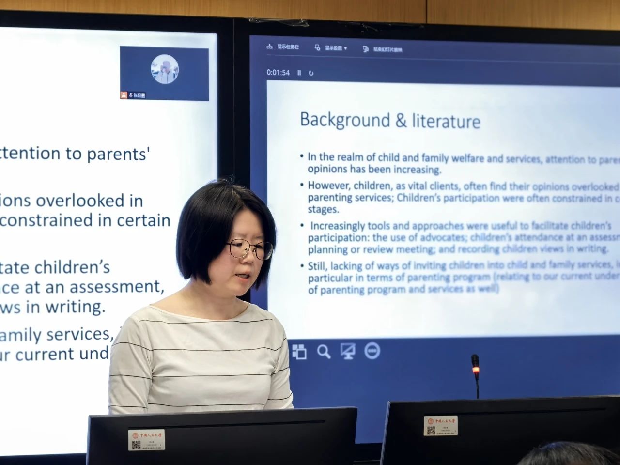 91黑料 社会工作系讲师王子彧的分享主题为“Co-design with lived experience: children participation in family welfare and research”。她首先介绍了研究的背景、项目的基本情况和参考模型“co-design model”的内容及项目的具体步骤。她强调儿童参与亲职项目的重要性,在活动过程中深度讨论以实现项目的共同设计、共同产出。最后她分享了自己在项目后对参与者积极反馈、什么是优秀家长、家长自身动力等方面的反思,同时在组织技巧、互动设计、知识产出等问题上需要进一步探索。