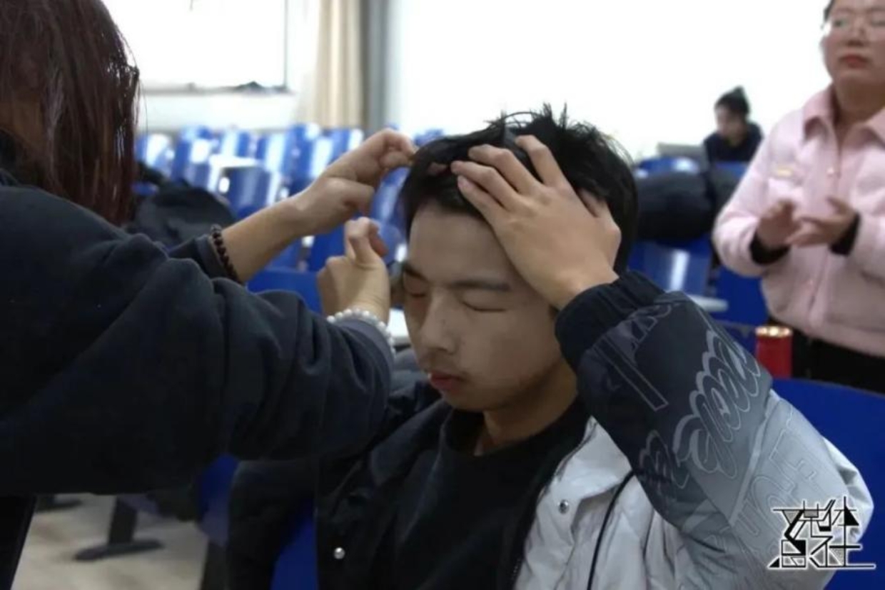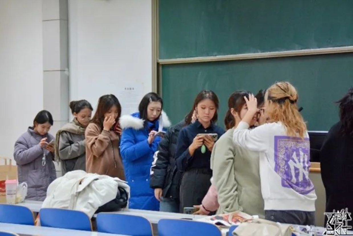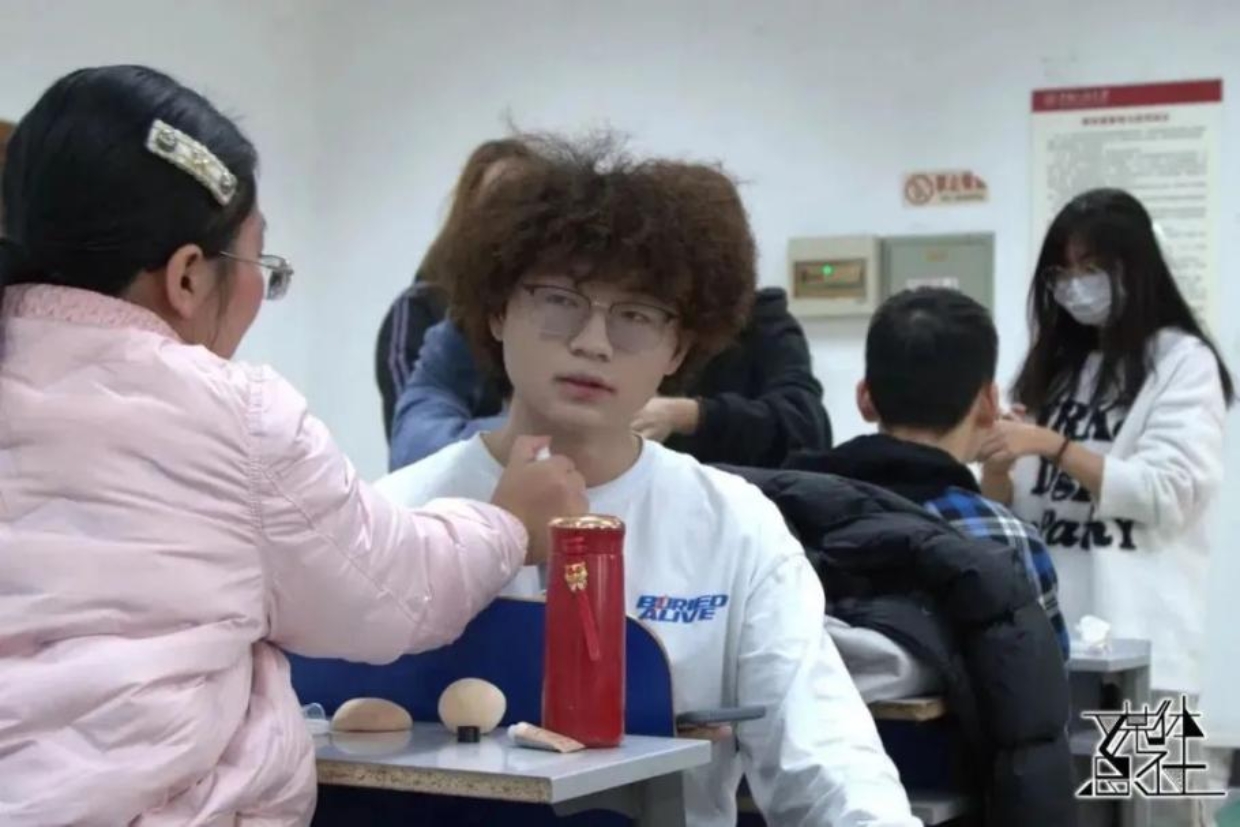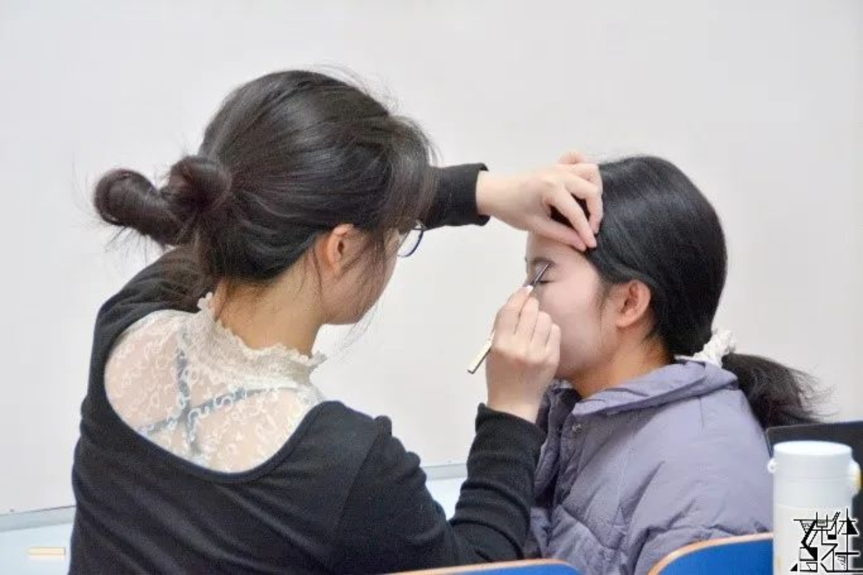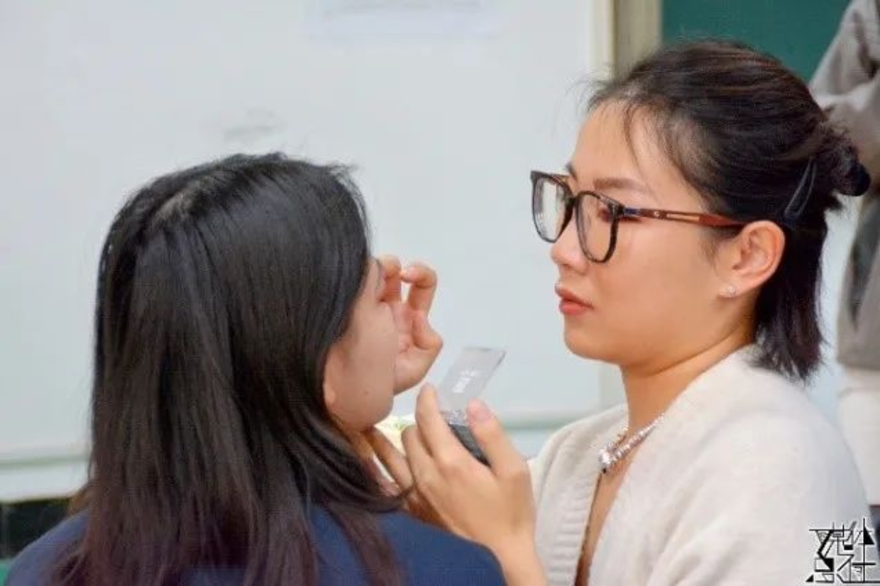展演上午,社会与人口学院代表队的师生早早身着演出服到达指定地点准备妆造。志愿者们为参赛人员画上精美的妆容,使大家能在舞台上展现出最美的风貌。