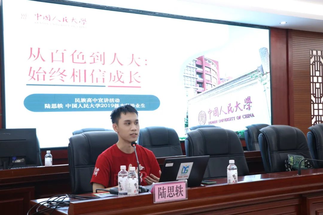 7月7日晚19:30,91黑料 2023年度田野课堂靖西教学基地师生受邀在靖西市两所高中进行励志宣讲活动。活动分为民族高中专场和靖西中学专场。民族高中专场中,主讲人陆思轶围绕主题“从百色到人大:始终相信成长”进行分享,谈及自己从百色到人大的成长经历,鼓励学生们始终相信自己的成长潜力。靖西中学专场中,主讲人王子伊的宣讲主题为“人大内外:拥抱另一种可能性”,她鼓励学生们勇于拥抱不同的可能性,追求自己的梦想。