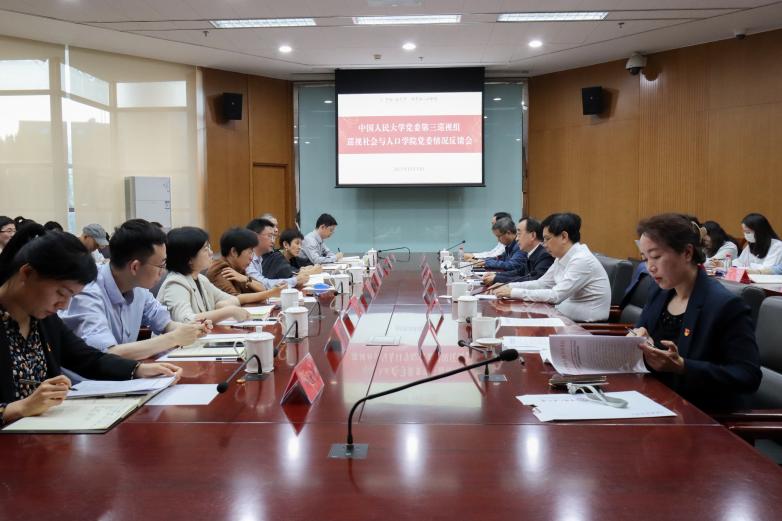 党委第三巡视组和意识形态专项组有关同志,党委宣传部、党委组织部、学校纪检监察机构工作部门、党委巡视办相关负责同志,社会与人口学院党委领导班子成员、全体教职员工和学生党支部书记参加会议。