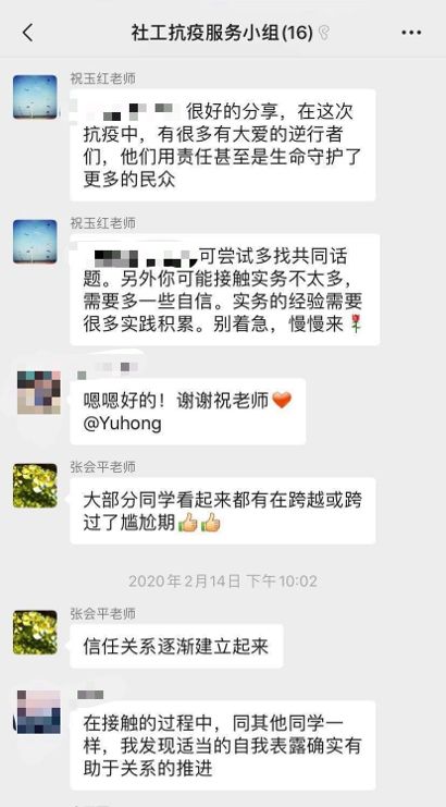 在全校师生共同抗击疫情的特殊时期,除了有针对性地开展各类活动,祝玉红老师每天都关心同学们的健康状况,及时传达学校和学院关于疫情防控的最新动态和要求,督促处于毕业季的同学们及时与导师沟通论文进度,同时在班级微信群里梳理毕业时间线、分享论文写作经验,以便帮助大家能够高效完成毕业任务。面对此次新冠疫情,祝玉红老师勉励2016级社会工作本科班的每一位同学,只争朝夕,不负韶华,团结一心,守望相助,用专业回馈社会,力争成为真正的“国民表率,社会栋梁”。