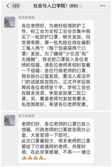 宋月萍老师是学院的工会主席,自疫情发生以来,她积极落实学校工会在疫情期间布置的各项工作,根据实际情况及时发放学校工会为教职员工筹集的防护口罩,看似简单的事情却开展得非常细致。考虑到行政老师坐班值班更频繁,防护用品的需求量更大,宋老师与部分教学岗的老师进行了细致沟通,大家赞同将更多的口罩发给行政老师;考虑到还未开学,大量老师还未返校,她逐个把口罩放进大家的信箱,方便老师们领取。她还积极为老师们多方筹集疫情防护消毒用品,并组织了学院老师参加“温暖武汉”专项捐款活动。